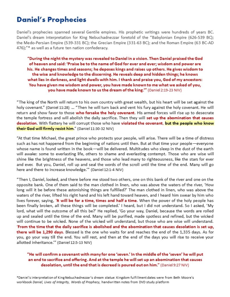 Daniel’s prophecies spanned several empires including the last days. His prophetic writings were hundreds of years BC. Daniel’s dream interpretation for King Nebuchadnezzar foretold of the Babylonian Empire (626-539 BC); the Medo-Persian Empire (539-331 BC); the Grecian Empire (331-63 BC); and the Roman Empire (63 BC-AD 476); as well as a future ten nation confederacy.