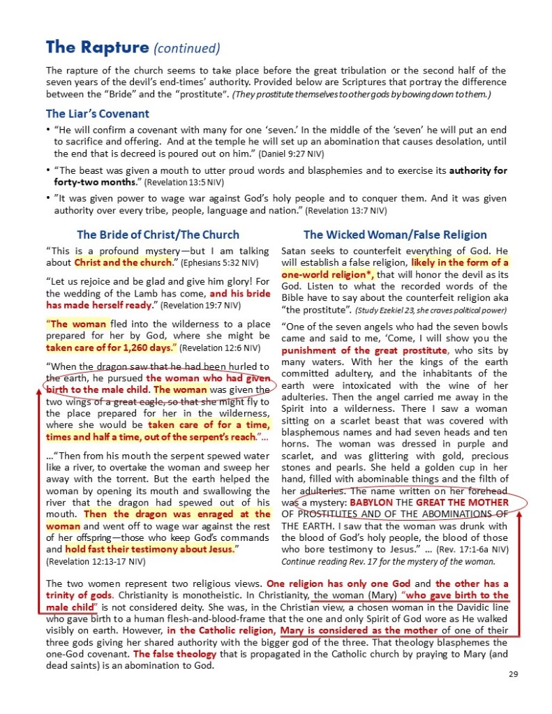This page expands on the earlier page posted about the rapture of the true church. The fake or counterfeit religion that worships a trinity of gods is considered a prostitute. There is only one God. His name is Jesus. Jesus is not a secondary god that “mother” Mary can lord herself over despite the false theology of the Catholic church who has spewed a trinity doctrine to seduce believers away from wholehearted allegiance to God.