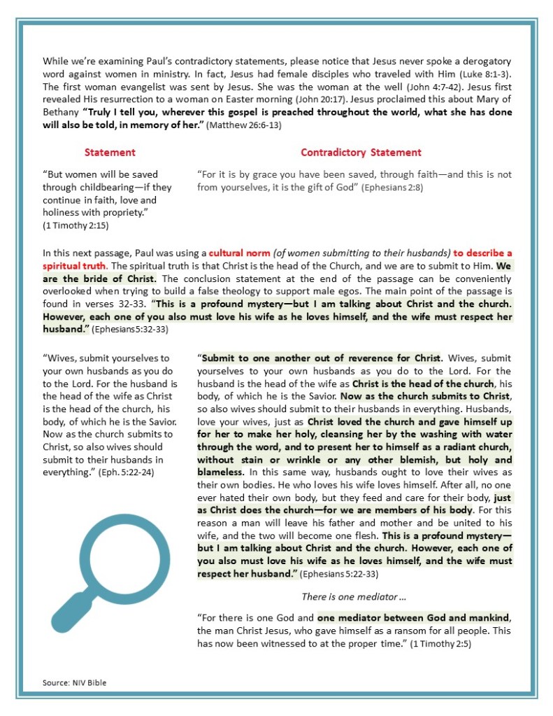 This is a 2nd page on the contradictory statements made by Paul about women that have been conveniently twisted to force gender prejudice against females in a male dominated church.
