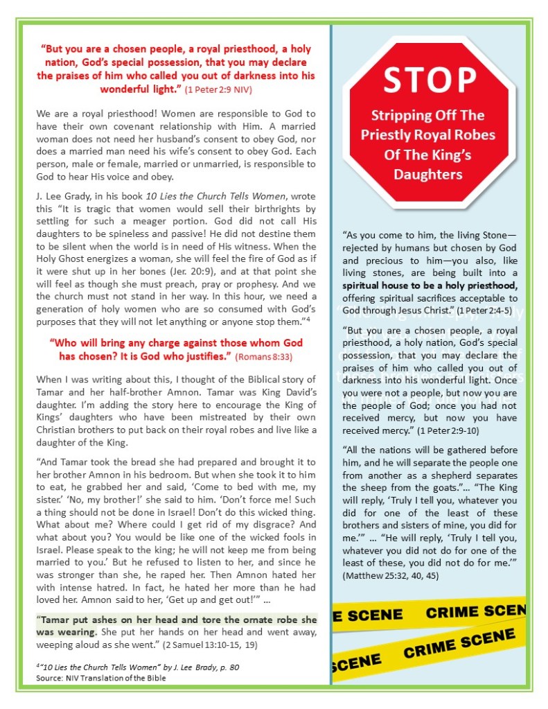 WOMEN: A Royal Priesthood Posted on July 22, 2023 by Tammie Edwards Share this: Click to share on X (Opens in new window) X Click to share on Facebook (Opens in new window) Facebook Like Loading... Related