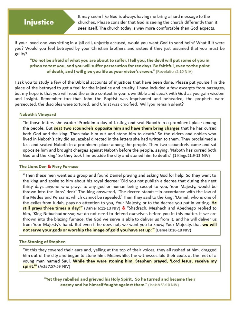 The latest edition of the Mark of Excellence Newsletter contains four pages about God’s heart for justice. The reader is asked to seek God for guidance going forward. Listen, we cannot be a silent church. We must expose lies and deliver truth to the nations!