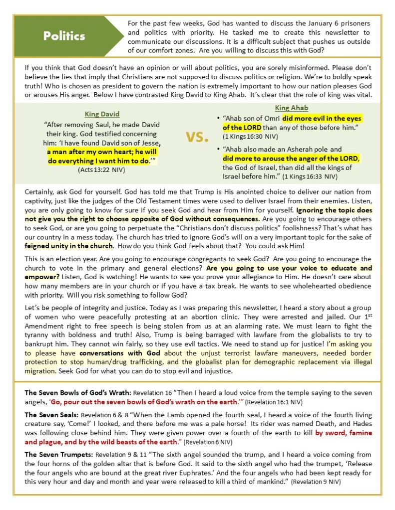 The latest edition of the Mark of Excellence Newsletters contains four pages about God’s heart for justice. The reader is asked to seek God for guidance going forward. Listen, we cannot be a silent church. We must expose lies and deliver truth to the nations!