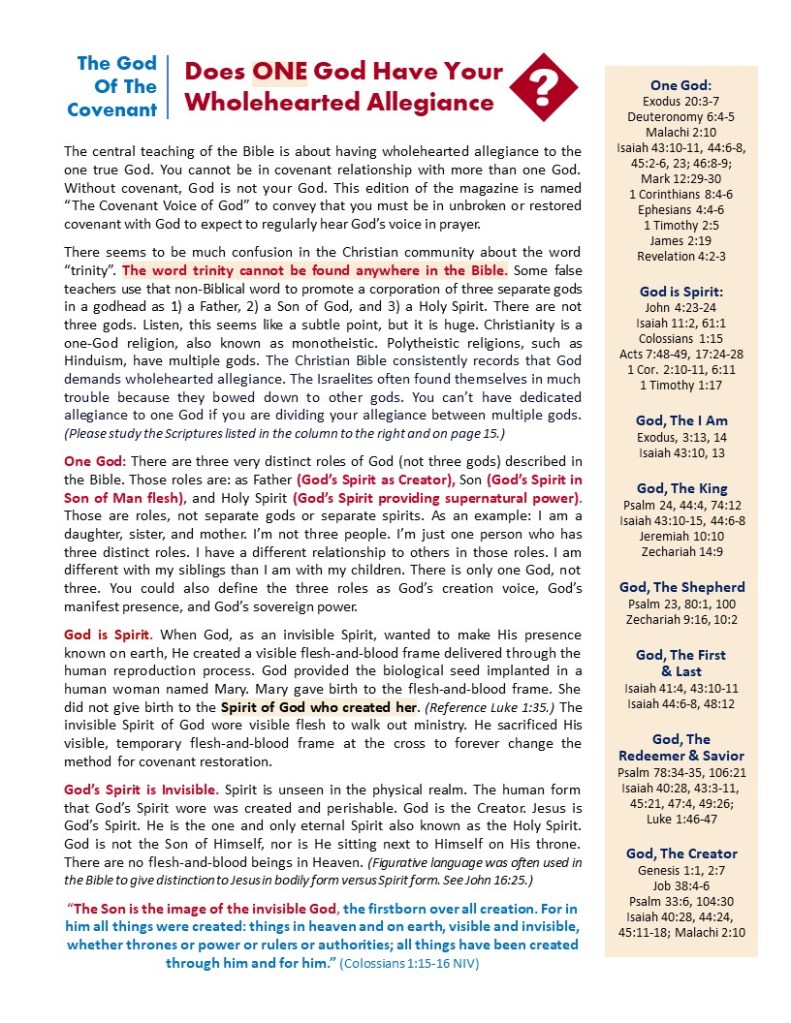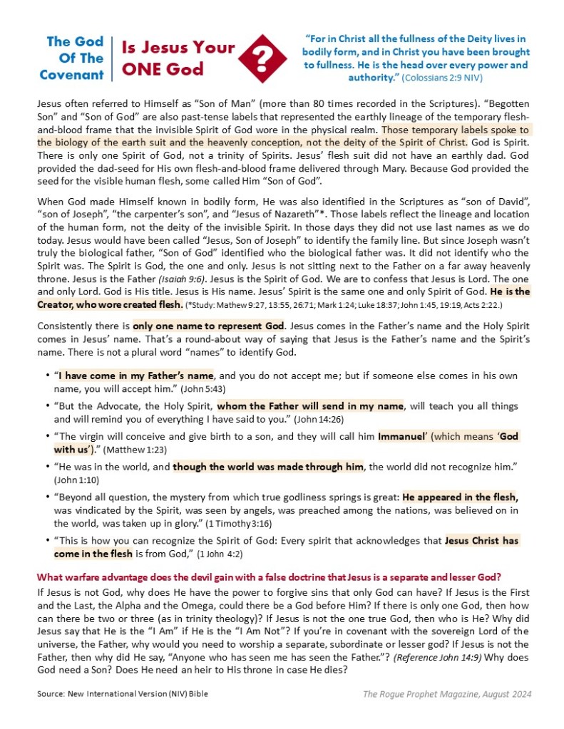 Attached (or available at the link below) are the four pages on “The God of the Covenant” from The Rogue Prophet Magazine, “The Covenant Voice of God” (pages 12-15, dated August 2024). These same pages were posted on 1/9/25. There are many Scriptures to study. Please use this as a place to start talking with God about this. I don’t expect you to do anything but ask God to truly speak to you on this doctrine. If you hear God, this should be an easy task. If you don’t hear God, I have been posting pages for the last few weeks to help you learn to discern God’s voice. I personally offer to teach you, and your pastor, how to hear God’s voice in prayer. I can be reached by email at Tammieswordoftheday@gmail.com.