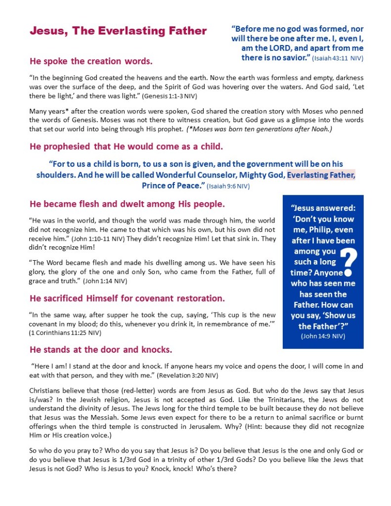 They didn’t recognize Him! He spoke creation. He spoke to the prophets and patriarchs. He became flesh … and they didn’t recognize Him. They crucified His (Son of Man) body! Do you know the Everlasting Father? Do you recognize His voice?