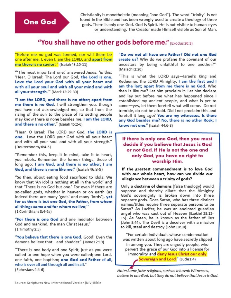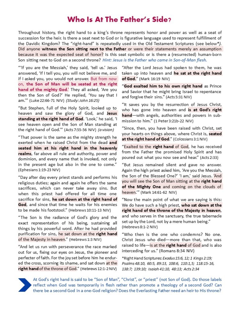 Often I hear pastors wrongly refer to the Son as sitting next to the Father. When I point out their error, they will inevitably bring up one of the Scriptures listed on the attached page, “Who Is At The Father’s Side?”, because they don’t understand that these are figurative language. There can only be one God in a one-God religion. God doesn’t need an heir to His throne because He is not going to die. God is all powerful, ever present, and all knowing. He doesn’t need help being God.