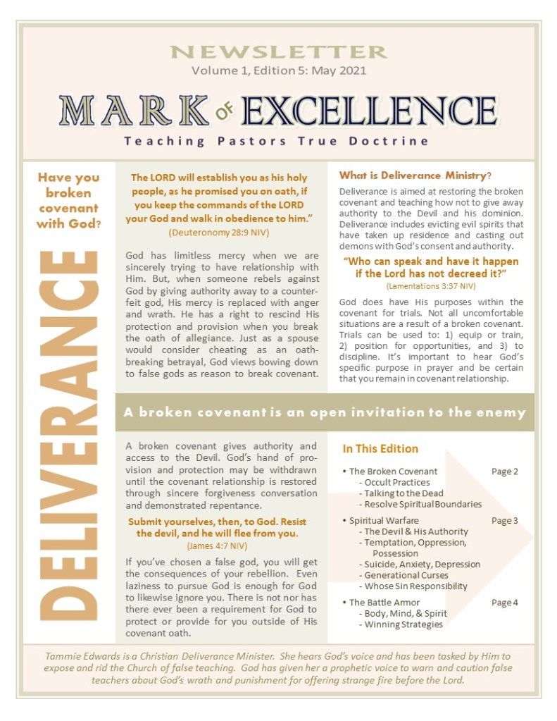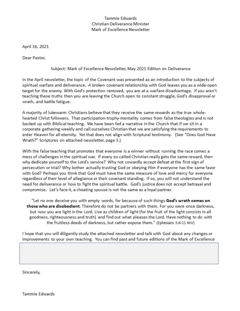 The attached pages are a continuation of the 2021 letters to the pastors locally. These pages from the May, Mark of Excellence Newsletter, explain Deliverance. At any time, you can stop right where you are and ask God for forgiveness. It’s this simple: “God, is there anything that I need to ask forgiveness for?” Then listen to His silent-prayer voice answer. Ask Him as many questions as you need to so that you may learn from your mistake and know how not to repeat them when facing the same temptations.