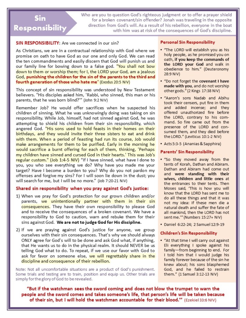 The attached page explains sin responsibility. Our family line is important when God’s justice is being expressed. We have a personal sin responsibility, a sin responsibility tied to our parents’ sins against God, and responsibility for our children’s sins too. But don’t believe me … ask God yourself.
