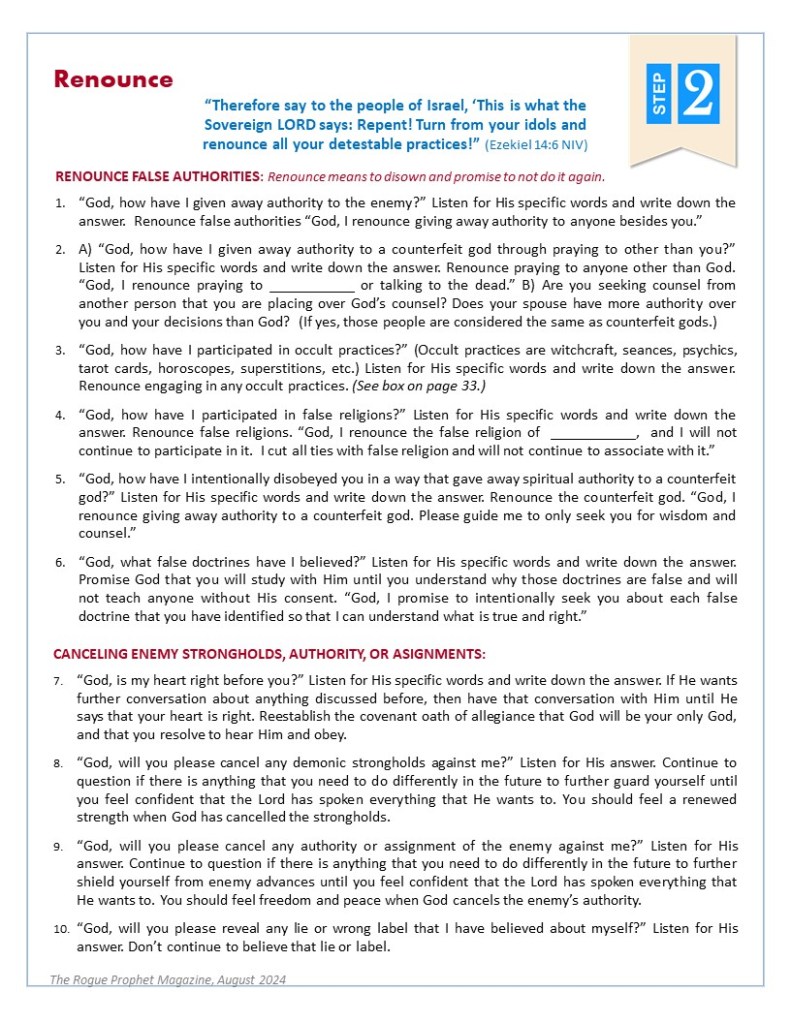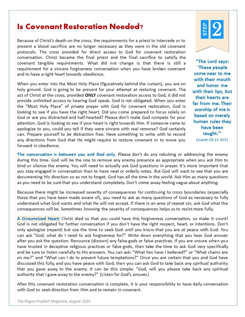 Attached are two pages (of six) from The Rogue Prophet Magazine, “The Covenant Voice of God” (pages 33-34, dated August 2024) that further outline the covenant restoration process. The remaining two pages, “Repent & Renounce” will provide the benefit of my deliverance expertise by providing specific questions for you to ask God so that you can hear directly from Him about right from wrong.
