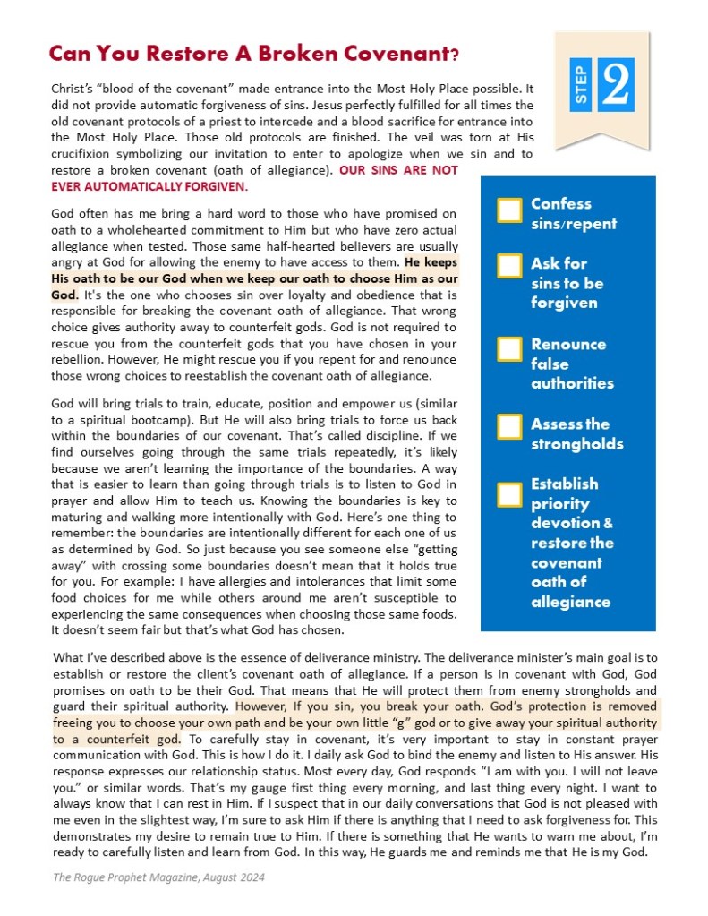Attached are two pages (of six) from The Rogue Prophet Magazine, “The Covenant Voice of God” (pages 31-32, dated August 2024) that outline the covenant restoration process. The remaining four pages of the six will be posted on subsequent days. Pages 3-4, “A Broken Covenant Oath”, describe the false religions, occult practices, and counterfeit gods that break covenant; Pages 5-6, “Repent & Renounce” will provide the benefit of my deliverance expertise by providing specific questions for you to ask God so that you can hear directly from Him about right from wrong.