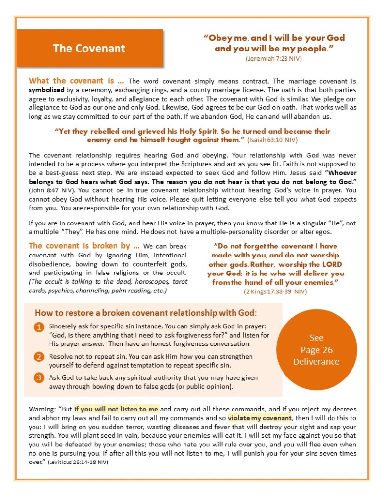Attached are two pages describing the covenant relationship. I hope it helps. I want you to learn to seek God and follow Him. Please know that this post is my specific act of obedience to God. He woke me up at 2:00 am to direct me to type this message to you. He spoke every word of it and authorized me to post it. My priority was in obeying Him whether you take the time to study or not. I’m not responsible for you. I’m responsible to obey God. So just like that $20 that I gave the lady in the park, I’m handing this to you. Maybe God knows that it is exactly what you need. I’ve done my part to obey God. Will you?