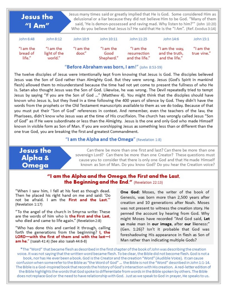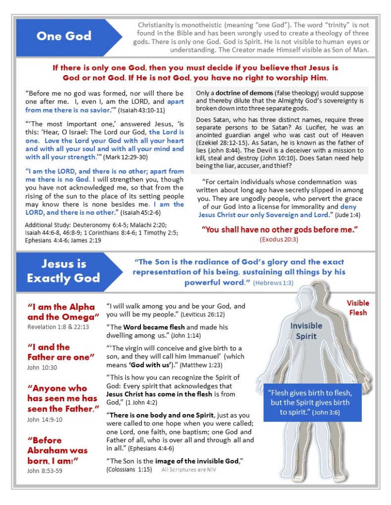 Study: Exodus 20:3-7, Deuteronomy 6:4-5; Mark 12:29-30, Malachi 2:20, Isaiah 44:6-8, Isaiah 45:2-6; Isaiah 46:8-9; 1 Corinthians 8:4-6, 1 Timothy 2:5, James 2:19, Ephesians 4:4-6, Revelation 4:2-3