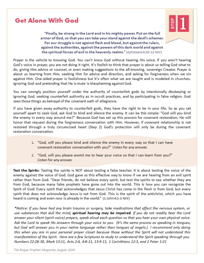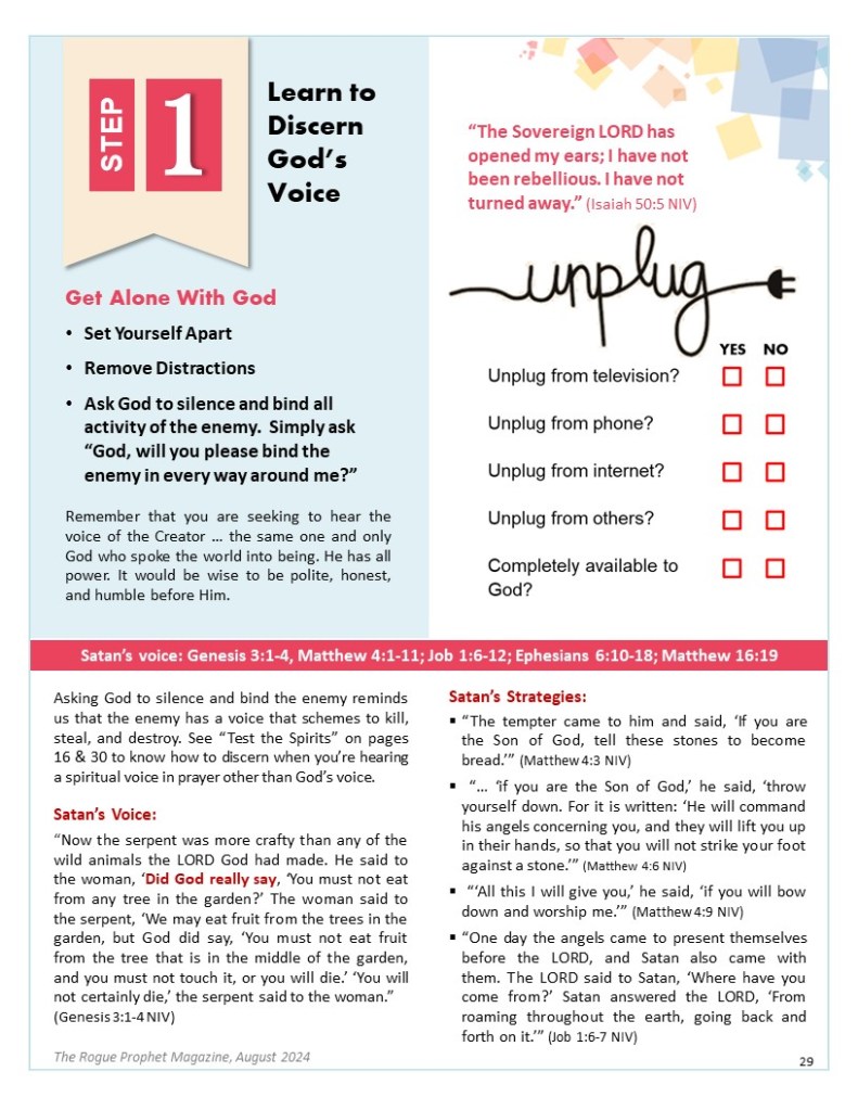 Attached are two pages from The Rogue Prophet Magazine, “The Covenant Voice of God” (pages 29-30, dated August 2024) that outline Step One of Discerning God’s Voice in Prayer.